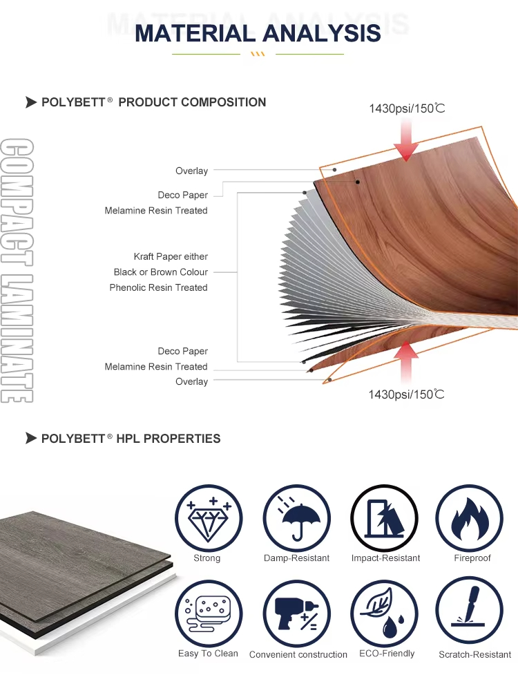 Zhongtian Polybett ® compact laminate is a structural panel faced with two sides decorative surfaces. For its high strength, impact, water and humidity resistance, it is ideal for interior use such as wall panels, toilet partition, counters, lockers and furniture. It could be drilled, tapped, sanded, shaped and cut with standard carbide tipped tools.The rich colors of compact laminate make it outstanding in decoration.